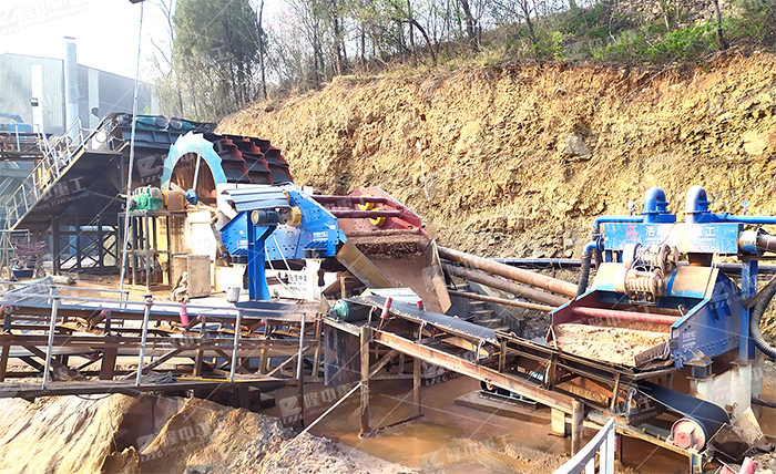 通過輪式洗砂機與擦洗機相結合,洗擦一體使物料與物料充分摩擦去 除表面附著物。混合物料首先進入擦洗機進行充分擦洗,達到泥砂分離效果。